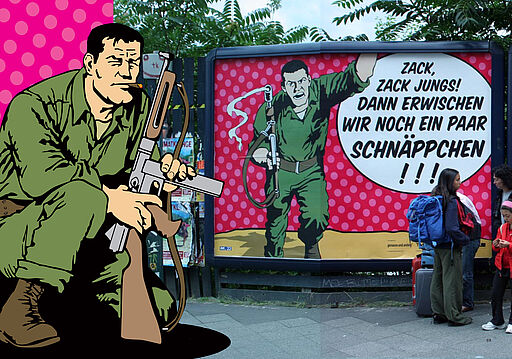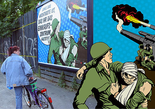Großplakate in Berlin-Mitte: Comicartige Szenen über Preiskampf, Kaufdruck und Werbewelten. Ein Projekt von Stephan König im Rahmen von „THE ABC – Semiotik des Widerstandes.