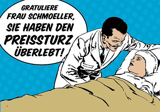Die Motive wirken wie Ausschnitte aus Comic-Heften: überzeichnet, emotional, sofort lesbar. Sie zeigen Preisschlachten, Kaufpanik und das Drama der Sonderangebote – und lassen den Unsinn so lange eskalieren, bis er seinen Sinn offenlegt.